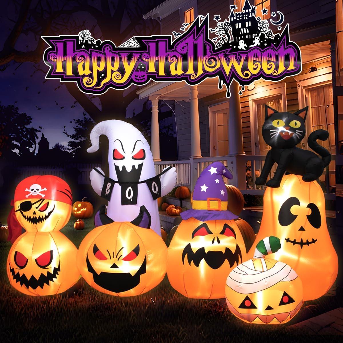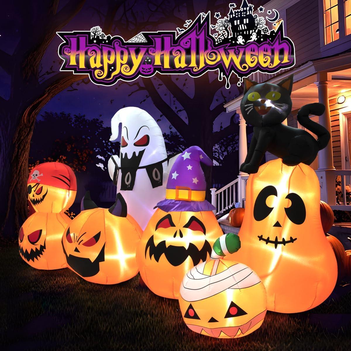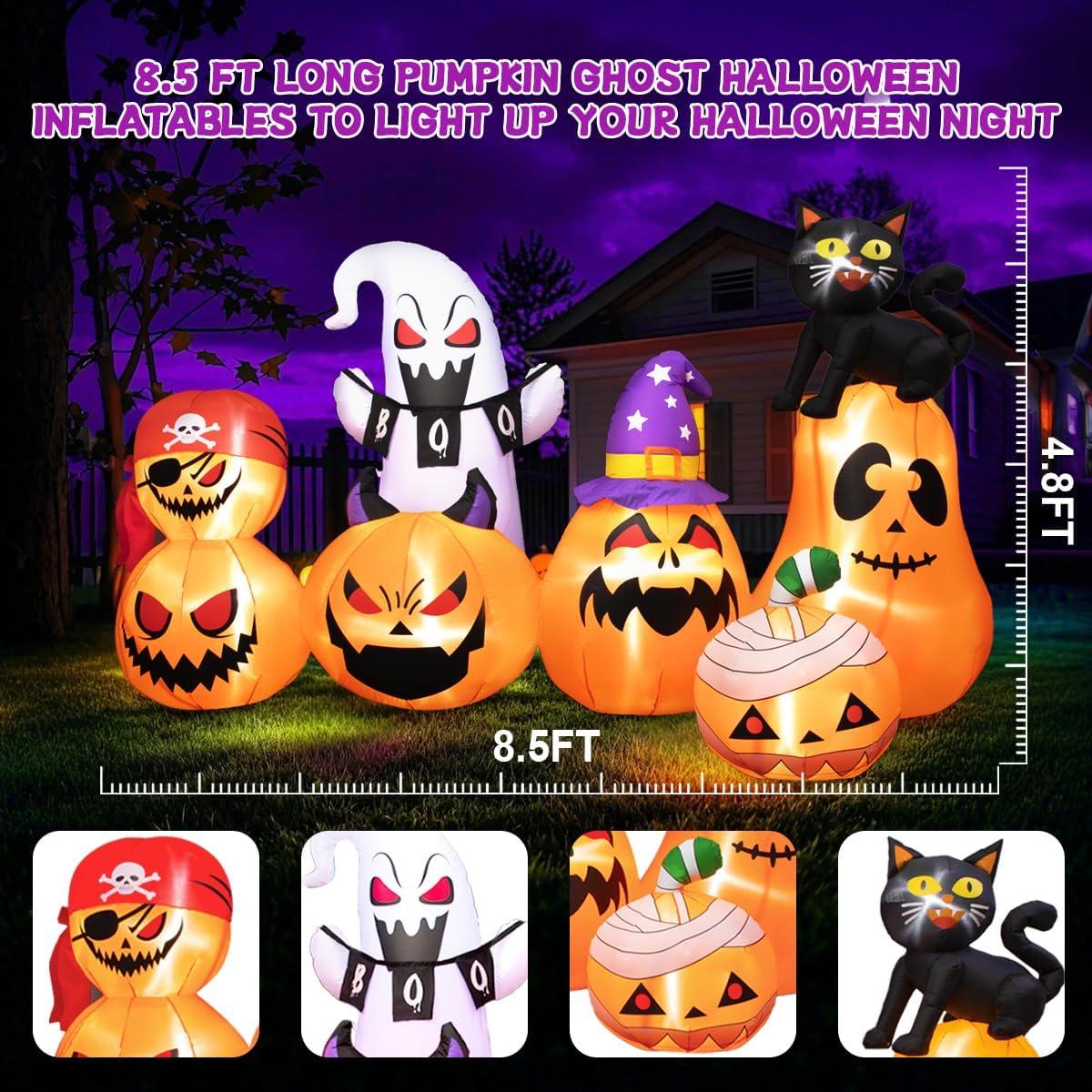 4 Classic Halloween Elements with Built-in Led Lights to Light Up Your Halloween Party. Meland 8.5 FT inflatable Halloween decorations include 5 expressive pumpkins, a black cat full of mysteriousness, a cute and scary little ghost, and a “witch” pumpkin, featuring 4 types of blow up Halloween decorations, rich appearance colors and horror themes present a more horrible and surprising Halloween night.