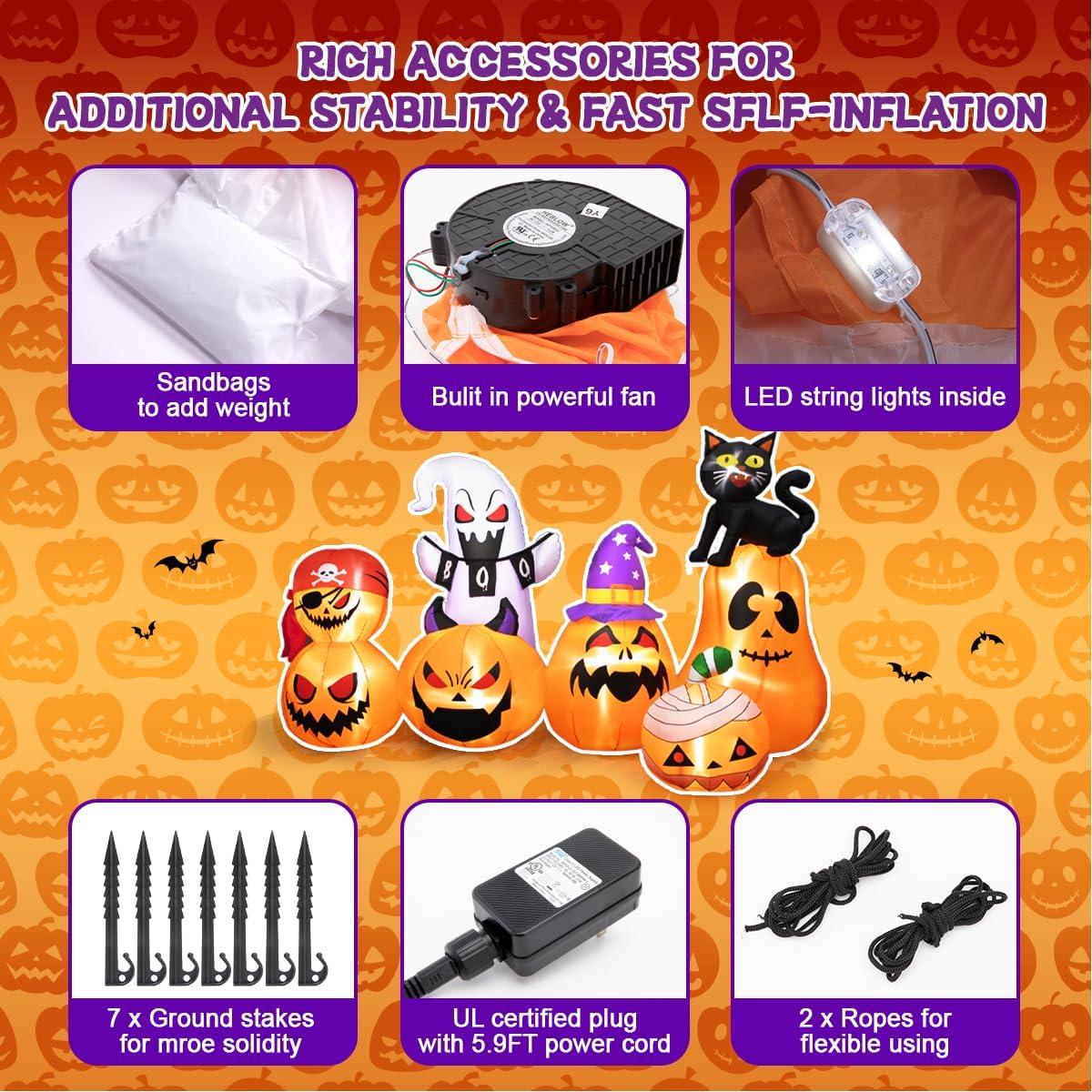 Rich Expressions and Styles Add Horror & Mystery to Halloween Night. The five pumpkin families have different expressions, the little ghost seems to welcome guests with unique scary poses, and the little black cat looks at the lively and marvelous Halloween night with amazement. A vivid Halloween blow up is accompanying you through this grand festival and night.