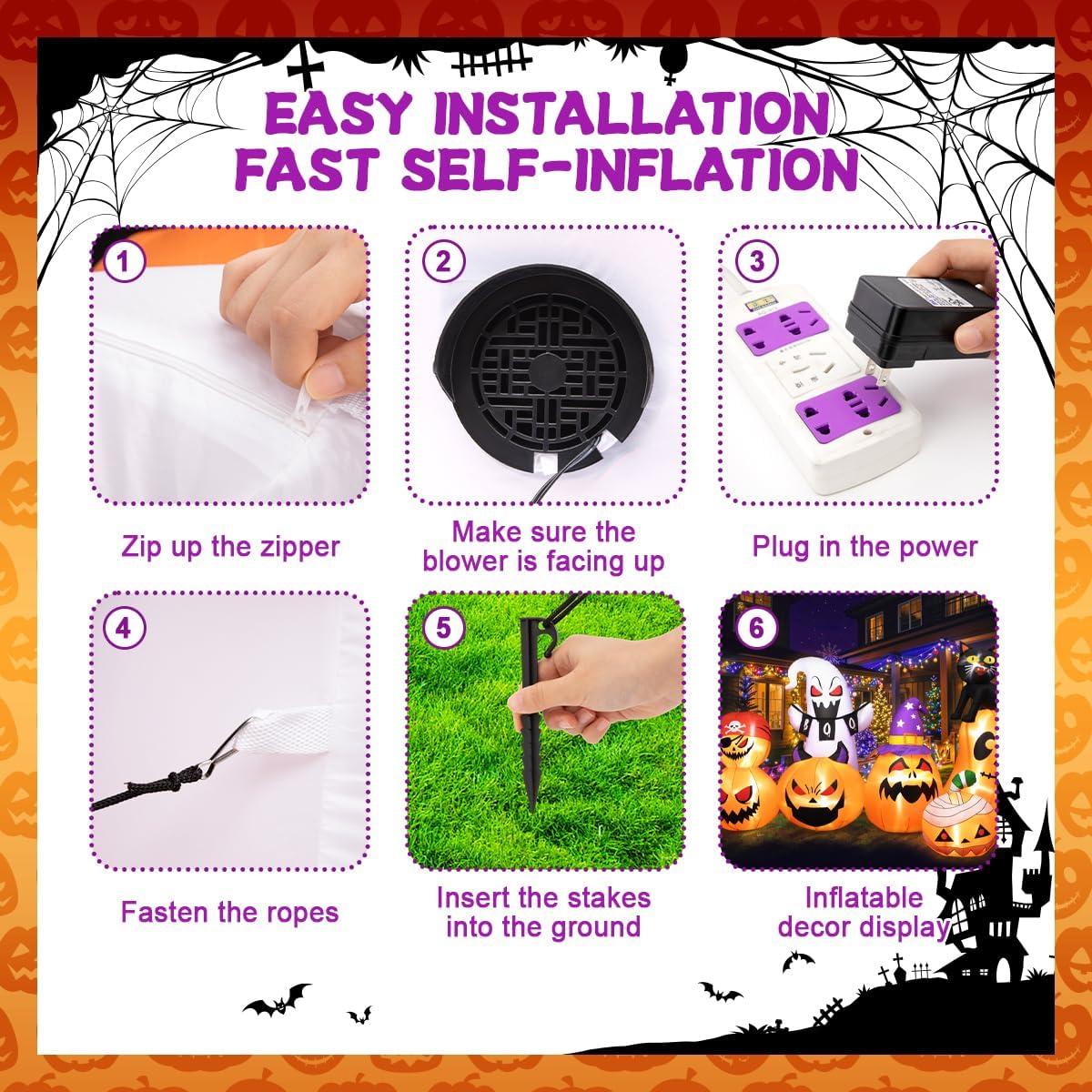 Self Inflation in Seconds, Easy to Install. The horror pumpkin outdoor decoration has a built-in fan. When it is plugged into a standard power socket, it will inflate in seconds. You will see the scary but funny pumpkin inflatables and little ghosts revealed by the built-in light, making Halloween night mysterious and full of enjoyment. A great Halloween decorations outdoor inflatables for Halloween night and trick or treat nights.